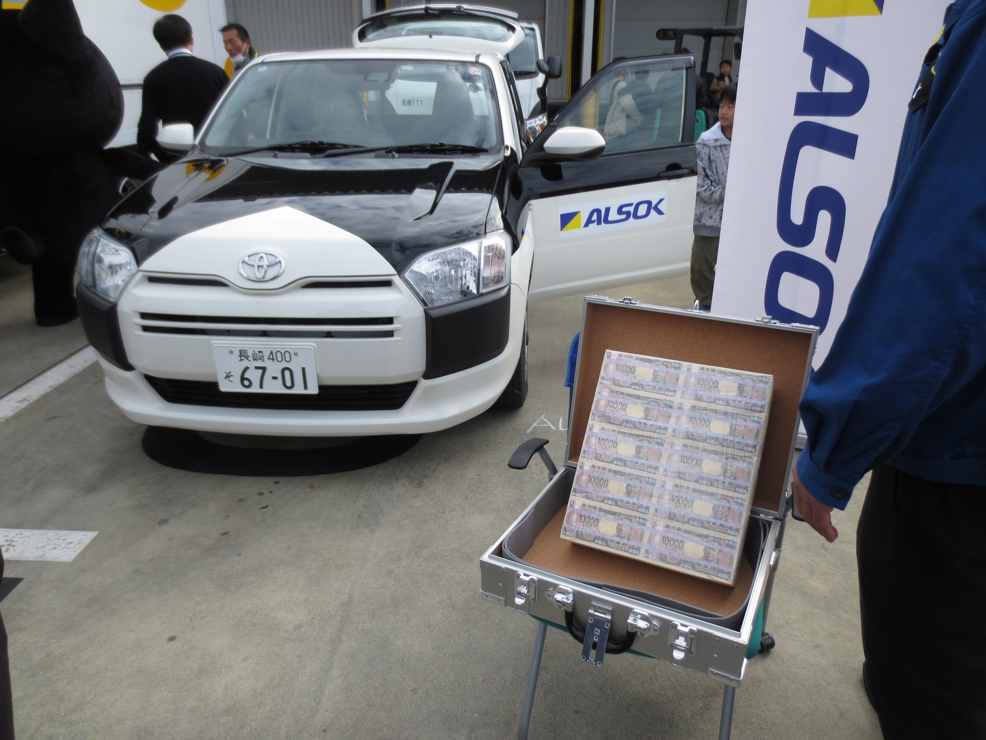 ・ALSOKの1億円アタッシュケースと防刃チョッキとヘルメット、警棒で親子で記念写真